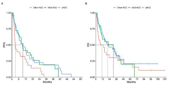 The first-line median PFS was 7.7 months (95% CI, 6.0–11.5), while the median OS was 18.5 months (95% CI, 13.3–33.2) for the 105 patients treated with systemic therapy. Comparing tumor histology, pRCC had an mPFS at the first-line treatment of 9.7 months (95% CI, 6.1–15.1), NOS-RCC had a mPFS of 9.2 (95% CI, 6.5–18.9) while other RCCs had a mPFS of 3.0 months (95% CI, 2.4–12.7) (p = 0.03). However, the mOS did not significantly differ between the three groups: mOS 20.7 months (95% CI, 13.7–42.4) vs. 30.7 (95% CI, 10.9–NR) vs. 10.7 (95% CI, 4.0–38.0) respectively (p = 0.34) (Figure 1).
