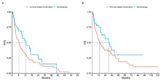 On the other hand, comparing the type of treatment received, patients treated with first-line immune-based combination therapy compared to those treated with first-line monotherapy had a slightly better mPFS (12.7 months, 95% CI: 9.2–27.7 vs. 6.4 months, 95% CI: 3.8–10.0, p = 0.10) and mOS (30.7 months, 95% CI: 8–33 vs. 13.7 months, 95% CI: 9.8–28.9, p = 0.10) (Figure 2).