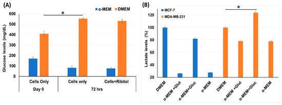 Measurement of glycolysis pathway molecules glucose and lactate level. (A) Glucose levels in MDA-MB-231 cells incubated with ribitol for 72 h in both DMEM and α-MEM media. (B) Lactate levels in MCF-7 and MDA-MB-231 cells cultured in DMEM and α-MEM media. Taken DMEM as a control to compare the lactate levels for analysis of different groups and read at OD570. Data are calculated from triplicate experiments. * Indicates a significant (* p < 0.05) difference compared with control. All data are mean ± SEM.