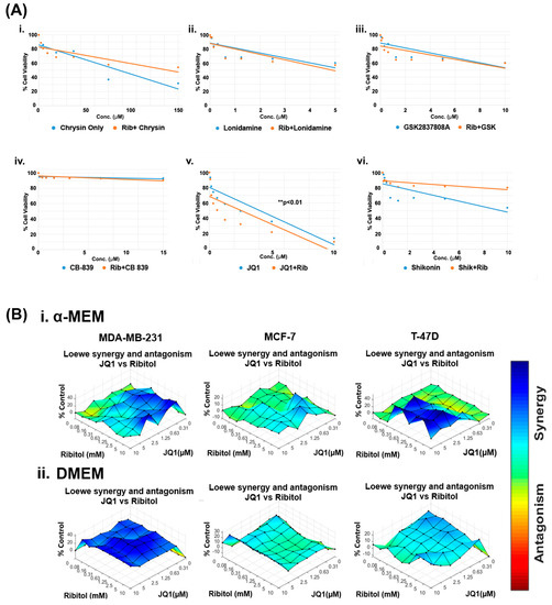 Ribitol treatment enhances the efficacy of JQ1. (A) Dose-response curve of MDA-MB-231 cells (i) Chrysin, (ii) Lonidamine, (iii) GSK2837808A, (iv) CB-839, (v) JQ1, and (vi) Shikonin with and without ribitol treatment measured using ATP detection (CellTiter-Glo assay). (B) Synergistic effect of ribitol and JQ1 on MDA-MB-231, MCF-7 and T-47D cells cultured under both α-MEM and DMEM media. Synergy between ribitol and JQ1 is analyzed by surface matrix plots. Data are expressed as the mean ± SEM from three independent experiments. ** p < 0.01 indicate significant difference compared to the untreated control.