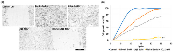 Our earlier work showed that ribitol alone did not affect the matriglycan expression and growth of MDA-MB-231 cells significantly. However, the effect of ribitol on cell migration has not been evaluated. We therefore performed a wound-healing assay to determine the effect of ribitol alone and in combination with JQ1 on the migration of the cells. Ribitol (5 mM) or JQ1 (1 μM) showing high synergy as described above were applied to the cells cultured in the DMEM medium. Once the scratch was made across the center of the wells, a live cell imaging system was used to record the movement of the cells migrating towards the gap over a period of 48 h (Figure 3). Moreover, we recorded a 48 h live video of the migration of breast cancer cells after treatment by the MuviCyte Live-Cell imaging system (see Supplementary Video S1).