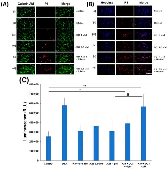Apoptosis of MDA-MB-231 cells after treatment with ribitol and JQ1. (A) Live/dead assay of breast cancer cells incubated with (i). Control; (ii) ribitol 5 mM; (iii) JQ1 1 µM; (iv) JQ1 0.5 µM; (v) ribitol 5 mM and JQ1 1 µM; (vi) ribitol 5 mM and JQ1 0.5 µM after 72 h of incubation; (B) Representative images of propidium iodide (PI)/Hoechst 33342 staining of the cells treated with (i). Control; (ii) ribitol 5 mM; (iii) JQ1 1 µM; (iv) JQ1 0.5 µM; (v) ribitol 5 mM and JQ1 1 µM; (vi) ribitol 5 mM and JQ1 0.5 µM after 72 h of incubation. Shown are the representative images at 200× magnification (scale bar = 100 µm); (C) the apoptosis measurements are expressed as total luminescence and measurements of luminescence signals as relative luminescence units (RLU). Breast cancer cells were exposed to ribitol and JQ1 in the presence of RealTime-GloTM Annexin V Apoptosis assay reagent. The cells were treated for 72 h. Docetaxel (DTX) was used as positive control to induce apoptosis. Each value represents the average of the independent experiments with triplicate determinations. * Significant compared to control cells (* p < 0.05, ** p < 0.01). # p < 0.05 indicates a significant difference between the JQ1 1 µm treated cells and combination treated cells. All data are mean ± SEM.