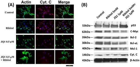 Immunocytochemical analysis of cytochrome C and Western blot analysis of apoptotic proteins. (A) Representative images of immunofluorescence analysis of cytochrome C staining of control, ribitol, JQ1, and ribitol+JQ1. After treatment of indicated doses of agents, MDA-MB-231 cells were incubated for 72 h, stained with anti-cytochrome C antibody, and photographed under fluorescent microscopy. Original magnification: 200× (scale bar = 100 µm). (B) Representative images of various pro/anti-apoptotic proteins, p53, c-Myc, Bcl-2, Bcl-xL, Mcl-1, and cytochrome C, by Western blot of MDA-MB-231 cells after treatment with ribitol and JQ1. Original western blots are presented in File S1.