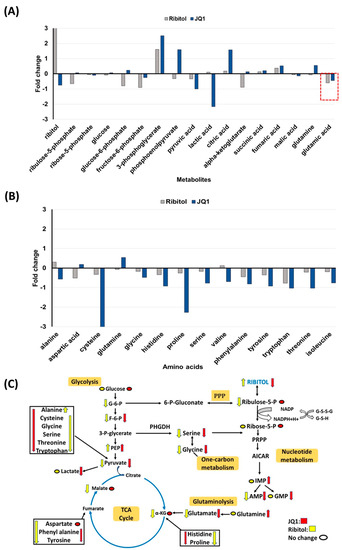 Metabolomics of MDA-MB-231 cells treated with ribitol and JQ1. (A) Alterations in intermediates of glycolysis and the TCA cycle. (B) Alteration of glucogenic and glucogenic-ketogenic metabolites and nucleotide metabolism. All glucogenic amino acid levels of tyrosine, phenylalanine and tryptophan were decreased after ribitol and JQ1 treatment compared to control. (C) Ribitol and JQ1 treatments decrease AMP levels and one-carbon metabolism with reduced glycine and serine levels. G-6-P: glucose-6-phosphate; F-6-P: fructose-6-phosphate: 3-P-glycerate: 3-phosphoglycerate; PEP: phosphoenolpyruvate; α-KG: α-ketoglutarate; PPP: pentose phosphate pathway; PRPP: phosphoribosyl pyrophosphate; AICAR: 5-aminoimidazole-4-carboxamide ribonucleotide; IMP: inosine 5′-monophosphate; AMP: adenosine monophosphate; GMP: guanosine monophosphate.