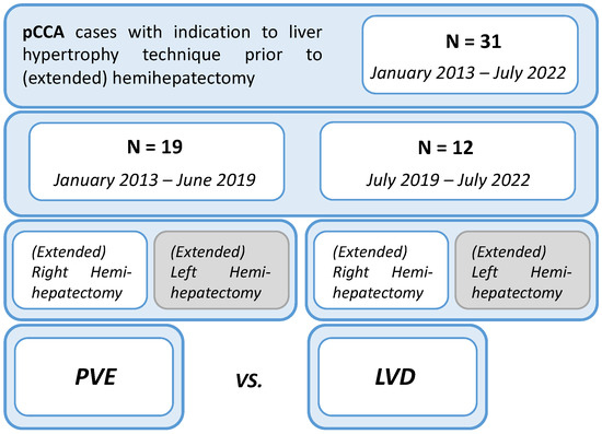 Between January 2013 and July 2022, data were retrieved and retrospectively analyzed from the prospectively maintained database of the Hepatobiliary Surgery Unit of San Raffaele Hospital in Milan for all consecutive patients diagnosed with PHC. All patients with a diagnosis of PHC from 2013 on are indeed preoperatively treated according to the institutional perioperative optimization protocol, including a specific evaluation of FLR volume and function to assess the indication for hypertrophy techniques prior to surgical resection. From January 2013 to June 2019, PVE was the preferred hypertrophy technique for all PHC cases, while starting from July 2019, LVD was introduced into the clinical practice to fully replace PVE. To assess the safety and efficacy profile of LVD, volumetric, functional, and postoperative outcomes were compared between the LVD cohort (July 2019–July 2022) and the PVE cohort (January 2013–June 2019). The study design is provided in Figure 1.