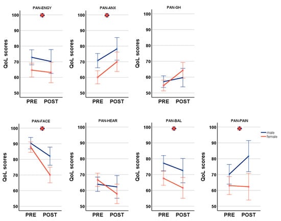 Disease-specific gender differences pre- and postoperative analyzed by the Penn Acoustic Neuroma Quality-of-Life Scale (PANQOL); PAN-ENGY: PANQOL energy; PAN-ANX: PANQOL anxiety; PANQOL-GH: PANQOL general health; PAN-FACE: PANQOL facial; PAN-HEAR: PANQOL hearing; PAN-BAL: PANQOL balance; PAN-PAIN: PANQOL pain.
