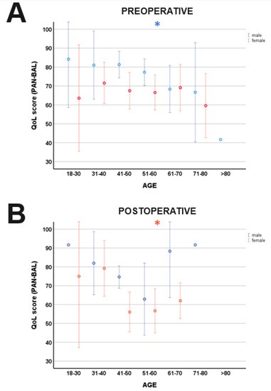 Age-related differences of balance (PAN-BAL). While there was a significant correlation between AGE and PAN-BAL in the male cohort preoperatively (A), postoperative women demonstrated more balance problems with increasing AGE (B). * indicates a significant correlation age and PAN-BAL. Blue lines: male; orange lines: female.