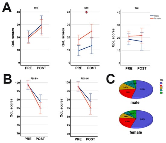 Symptom-specific gender-differences pre- and postoperative. (A) Women were significantly more affected by dizziness (DHI) than men, while no gender-differences were detected for HHI and THI; (B) facial function decreased postoperative in both genders with women more affected; (C) postoperative HB scores demonstrated no differences between genders (H = 0.01, p = 0.930; Kruskal–Wallis); HHI: Hearing Handicap Inventory, DHI: Dizziness Handicap Inventory, THI: Tinnitus Handicap Inventory;