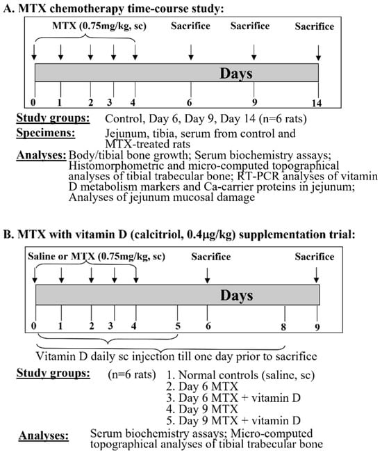 Sprague Dawley male rats (6 weeks old, with body weights of around 145 g) were housed at 24 °C with a 12-h light/dark cycle. They were supplied ad libitum with tap water and a commercial standard rat chow diet containing 0.8% calcium, 0.7% phosphorus, and 2000 U/kg vitamin D (cholecalciferol) (Specialty Feeds, Glen Forrest, WA, Australia). MTX (M9929, Sigma-Aldrich, St. Louis, MO, USA) was dissolved firstly in dimethyl sulfoxide (Sigma-Aldrich) and then diluted in saline before use. Rats were weighed daily and received MTX at 0.75 mg/kg subcutaneously (sc) once daily for 5 consecutive days (mimicking the intense MTX treatment for ALL) as described in [23,24]. Groups of MTX-treated rats were euthanised by CO2 overdose on days 6, 9, and 14 after the initial MTX dose (n = 6 rats/group), the time points which were previously found to have partial (day 6) and significant (day 9) histological damages and near normal recovery (day 14) in tibial metaphysis bone of treated rats [23]. A group of saline-injected rats was also euthanised on the same day as the MTX-treated day 14 rats, which served as the control group for growth measurements alongside the MTX day 14 group. For the control rats and MTX-treated rats euthanised on day 14, the total body lengths were measured (from the tip of the nose to the tip of the tail) at the time of the first MTX injection and at euthanasia, and the lengths of the left tibia were also measured at sample collection. Serum, specimens of the proximal region of the small intestine (jejunum), and tibial bones were collected for biochemical, structural, and gene expression analyses [23,25] (Figure 1A).