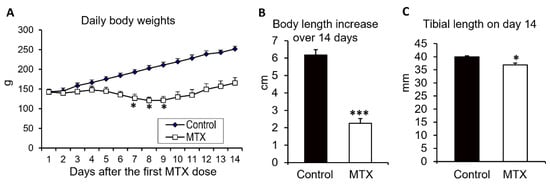Effects of methotrexate (MTX) chemotherapy (5 once-daily injections at 0.75 mg/kg) on (A) daily body weights, (B) total body length gain over the 14-day experimental period, and (C) the total tibial lengths of control rats or MTX-treated rats euthanised on day 14 after the first MTX dosing. One-way ANOVA was used for data analyses (n = 6). * p < 0.05 and *** p < 0.001 compared to the initial body weights at the start of MTX dosing or to the control group on day 14.