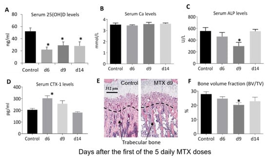 Effects of methotrexate (MTX) chemotherapy (5 once-daily injections at 0.75 mg/kg) on serum levels of (A) vitamin D (25(OH)D), (B) calcium (Ca), and markers of bone turnover, including (C) alkaline phosphatase (ALP) and (D) collagen type I cross-linked C-telopeptide or CTX-1), as well as proximal tibial metaphysis bone (E) morphology as shown on microscopic images of hematoxylin- and eosin-stained sections (showing loss of trabecular bone particularly within the secondary spongiosa—the region below the dashed line, with arrows pointing to bone trabeculae; scale bar = 312 μm), and (F) bone volume fraction (bone volume/total tissue volume, BV/TV), on days (d) 6, 9, and 14 after the first MTX dosing. Two-way ANOVA was used for data analyses (n = 6). * p < 0.05 compared to the saline-treated control group.