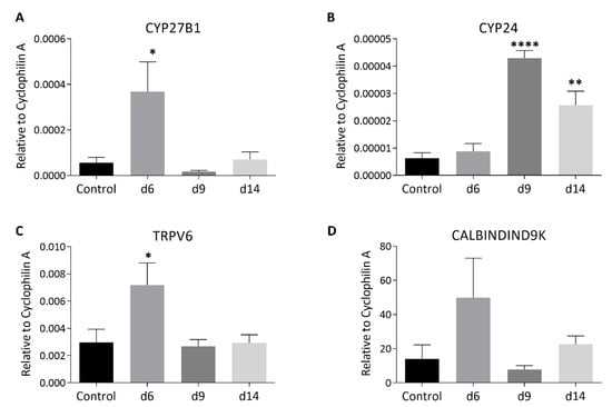 In the normal state, increasing the intestinal absorption of ingested calcium is central to the maintenance of calcium homeostasis by vitamin D [22]. This is via increasing local synthesis of calcium-carrying proteins, including TRPV6 and CALBINDIND9K [39,40]. In addition, vitamin D metabolism has been found to occur locally in the intestine [41,42]. Thus, the current study has examined the effect of MTX chemotherapy on intestinal expression of the key calcium-carrying proteins TRPV6 and CALBINDIND9K as well as the key metabolism enzymes CYP27B1 (responsible for converting the inactive 25(OH)D to the active hormonal form of 1,25(OH)2D) and CYP24 or CYP24A1 (the major vitamin D 24-hydroxylase that catabolises 25(OH)D and 1,25(OH)2D) [42,43] (Figure 4). On day 6 after MTX chemotherapy, there were significant increases in mRNA expression of the key activating enzyme CYP27B1 (p < 0.05 vs. control) (Figure 4A) and of the key Ca-carrying protein TRPV6 (p < 0.05 vs. control) (Figure 4C) (as well as a trend of an increase in CALBINDIND9K, p > 0.05 vs. control) (Figure 4D). Of note, the high level of CALBINDIND9K mRNA expression in the canine proximal small intestine has also been found previously [44]. However, the increases in expression of these molecules returned to normal levels on days 9 and 14 (p > 0.05 vs. control). On the other hand, interestingly, levels of expression of the vitamin D catabolising enzyme CYP24 were found to have no changes on day 6 (p > 0.05 vs. control) but increased significantly on days 9 (p < 0.0001 vs. control) and 14 (p < 0.01 vs. control) (Figure 4B). These changes suggest an increase in activating 25(OH)D to 1,25(OH)2D and in Ca absorption demand locally in the intestine during the early stage after MTX chemotherapy, which returns to normal levels during the later recovery stage.