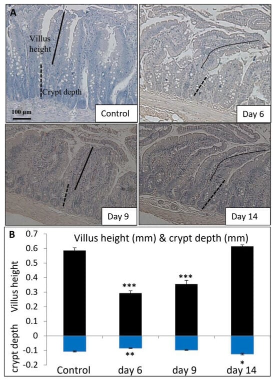 To examine whether the changes in vitamin D metabolism enzymes and Ca-binding proteins were associated with MTX-induced intestinal damage and subsequent repair, the current study further examined MTX chemotherapy-induced changes in mucosal structure in the small intestine (jejunum segment) on days 6, 9, and 14 after the first of the five daily MTX injections (Figure 5A). A significant shortening of jejunal mucosal villi was observed on day 6 (p < 0.001 vs. control), which showed a partial recovery on day 9 (despite still being p < 0.001 vs. control) and a complete recovery on day 14 (p > 0.05 vs. control) (Figure 5B). There was also a significant reduction in the crypt depth on day 6, which returned to normal on day 9 (p > 0.05 vs. control) and appeared overshot on day 14 (p < 0.05 vs. control) (Figure 5B).