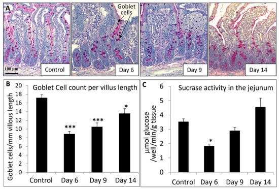 Consistent with the mucosal structural changes described above, MTX chemotherapy also resulted in a time course of changes in some indicators of intestine damage/repair and function (presence of goblet cells and sucrase activity) in the jejunum. As shown by PAS staining (Figure 6A) and quantification of stained cells, there was a significant loss of goblet cells in the jejunal villi on days 6 (51% of control, p < 0.001) and 9 (61% of control, p < 0.001) but a significant recovery on day 14 (79% of control, p < 0.05) (Figure 6B). Furthermore, as a measure of changes in intestinal digestive function, MTX treatment caused a significant decrease on day 6 (52% of control, p < 0.05) in the activity of sucrase (an intestinal brush-border hydrolase that catalyses the hydrolysis of sucrose), which returned towards the normal level on days 9 (82% of control, p > 0.05) and 14 (128% of control, p > 0.05) (Figure 6C). These results suggest that acute MTX chemotherapy causes significant transient changes in mucosal structure, goblet cell population, and hydrolase sucrase activity in the intestinal mucosa.