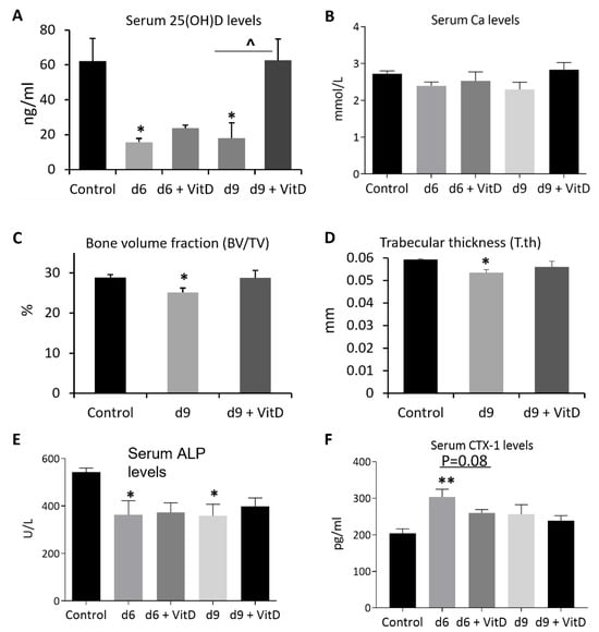 Effects of methotrexate (MTX) chemotherapy (5 once-daily injections at 0.75 mg/kg) with or without supplementation of active form of vitamin D (+ VitD) (calcitriol given subcutaneously once daily at 0.4 mg/kg until one day prior to being sacrificed) on levels of (A) serum vitamin D (25(OH)D), (B) serum calcium (Ca), (C) bone volume fraction (bone volume/total tissue volume, BV/TV), and (D) trabecular bone thickness (T.th) of proximal left tibia, as well as levels of serum markers of bone turnover: (E) alkaline phosphatase or ALP and (F) collagen type I cross-linked C-telopeptide or CTX-1), on days (d) 6, 9, and/or 14 after the first MTX dosing. Two-way ANOVA was used to analyse data without different time points, and three-way ANOVA was used to analyse data with different time points (n = 6). * p < 0.05 or ** p < 0.01 compared to the control group, and ^ p < 0.05 or p = 0.08 comparing the two groups under a horizontal bar.