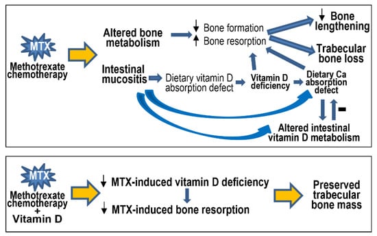 Schematic representation of methotrexate (MTX) chemotherapy-induced altered bone metabolism (decreased bone formation but increased bone resorption), bone growth impairments, and trabecular bone loss, which can also result indirectly and at least partially from MTX-induced intestinal mucosal damage (mucositis). Intestinal mucositis causes defects in absorption of dietary vitamin D (resulting in vitamin D deficiency) and calcium (Ca), and it alters intestinal vitamin D metabolism that can improve Ca absorption. Vitamin D supplementation can attenuate MTX-induced vitamin D deficiency and prevent the resultant bone resorption and bone loss. Small up and down arrows indicate increases and decreases, respectively.
