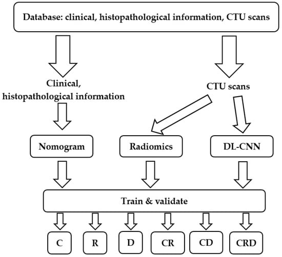Predictive model development process of this study. We collected clinical, histopathological information and CTU scans. We built and validated survival prediction models based on individual or combined descriptors. C = clinical descriptors; R = radiomics descriptors; D = deep-learning descriptor; CR = clinical + radiomics descriptors; CD = clinical + deep-learning descriptors; CRD = clinical + radiomics + deep-learning descriptors. DL-CNN = Deep learning–convolutional neural network.