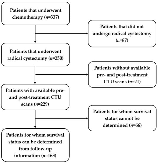 With Institutional Review Board approval, histopathological information and CTU scans were collected for patients who had been diagnosed with bladder cancer. Patients were selected if they met all of the following criteria: (1) patients who underwent neoadjuvant chemotherapy and had at least one CTU scan before chemotherapy and one after chemotherapy; (2) patients who underwent radical cystectomy; (3) patients for whom follow-up information after surgery was available to determine their survival status.