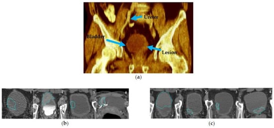 CTU scans for bladder cancer include a series of abdominal images, allowing for a comprehensive 3D inspection of the bladder. Figure 3a shows an example of a rendered 3D CTU scan. To extract radiomics and deep features from the CTU scans, the bladder cancer lesions were annotated by an experienced radiologist (R.H.C.) who has over 30 years of experience reading abdominal CT. The annotation process entailed several steps: (1) marking a volume of interest (VOI) for the lesion, (2) measuring the longest and perpendicular diameters of the tumor, (3) identifying the lesion location within the bladder, ureter, or other abdominal locations, and (4) evaluating the lesion type, edge characteristics, and likelihood of abnormality. While a patient could have multiple lesions, for this study, we limited the number of lesions to one per patient and selected the dominant lesion for feature extraction.