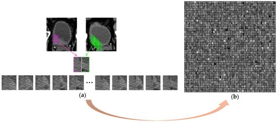 To extract deep features from the paired pre- and post-treatment scans, we employed a hybrid-ROI strategy [28]. This approach, illustrated in Figure 4a, involved creating a hybrid-ROI that is composed of one ROI of size 32 16 pixels from the pre-treatment scan on the left side and one ROI of the same size from the post-treatment scan on the right side. The resulting hybrid ROI has a size of 32 32 pixels. We utilized a sliding-window technique to extract the ROIs from the VOI. To ensure a balanced dataset and prevent dominance or bias caused by CTU scan pairs with large lesions, we imposed a threshold to limit the number of hybrid ROIs from one scan pair. All hybrid ROIs from the same case were assigned the same case label, survived over 5 years = 1, otherwise = 0. A subset of hybrid ROIs from the training set is shown in Figure 4b.
