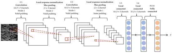 Architecture of CNN. The input image has a size of 32 32 pixels. The CNN was composed of two convolution layers (C1 and C2), each of them was followed by a local response normalization layer and a max-pooling layer, two locally connected layers (L3 and L4), and one fully connected layer (FC10). The kernel, stride, and padding setting of each layer are illustrated. The output is a likelihood score.