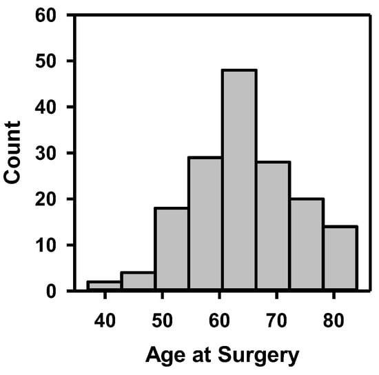 The demographic information and cancer stage of the 163 patients are shown in Table 1, including gender, race, tobacco use, clinical stage of cancer, and pathological stage of cancer after radical cystectomy. The distribution of patients’ age at surgery is depicted in Figure 7. These statistics show that the dataset covered a wide range of patient demographics.