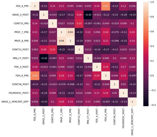 Out of the 12 selected features, we plotted a heatmap showing the correlation values between each pair of features (Figure 8). The majority of the correlation values fell within the range of ±0.3, indicating weak correlations. Weak correlations implied that the selected features were providing mostly distinct and independent information, which can contribute to the predictive power of the model with a low redundancy. On the other hand, the features with a certain level of correlation may contribute to the predictive power when combined with other features.