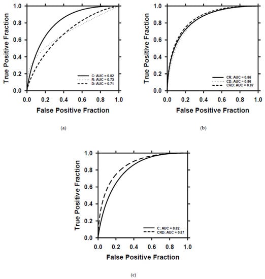 The classification performance of the descriptors was evaluated using the area under the receiver operating characteristics (ROC) curve (AUC). We compared three combinations of descriptors for survival prediction (C vs. CRD, R vs. CRD, and D vs. CRD); thus, the critical value for statistical significance was adjusted to be = 0.017 ( = 0.05/3) according to the Bonferroni correction for multiple hypothesis testing [31,32].
