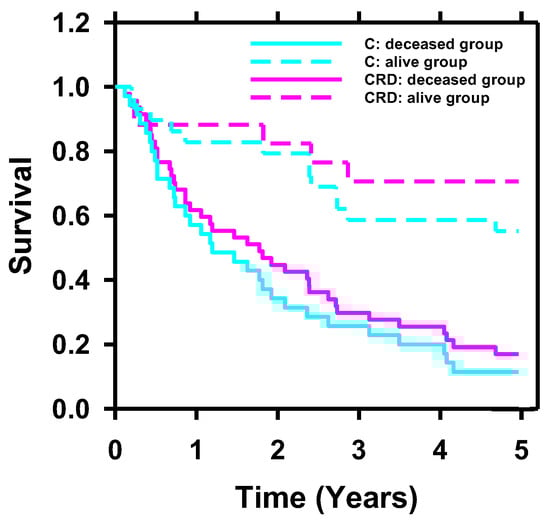 Kaplan–Meier survival probability analyzed with C and CRD descriptors. Stratification of the two groups (deceased and alive) achieved statistical significance using C (p < 0.001) and CRD (p < 0.001) descriptors. For the alive group, the survival curve of CRD was superior to that of C.