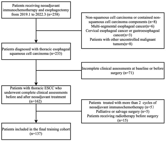 - Wang, H.; Jiang, Z.; Wang, Q.; Wu, T.; Guo, F.; Xu, Z.; Yang, W.; Yang, S.; Feng, S.; Wang, X.; et al. Pathological response and prognostic factors of neoadjuvant PD-1 blockade combined with chemotherapy in resectable oesophageal squamous cell carcinoma. Eur. J. Cancer 2023, 196–210. [Google Scholar] [CrossRef]
