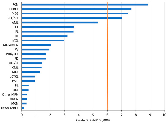 HMs represent a wide variety of malignancies. Following the RARECARENet [3] definition of rare cancers (crude rate (CR) of 6/100,000 person-years), only plasma cell neoplasms (PCNs), diffuse large B-cell lymphoma (DLBCL), MDS, and CLL/SLL can be considered “common”. With a CR of 5.4, AMLs are close to the cut-off of 6. However, AMLs are subdivided into at least 22 different subtypes, all of which are considered “rare” [2], as are all other HM types with CRs below 4 (Figure 1).
