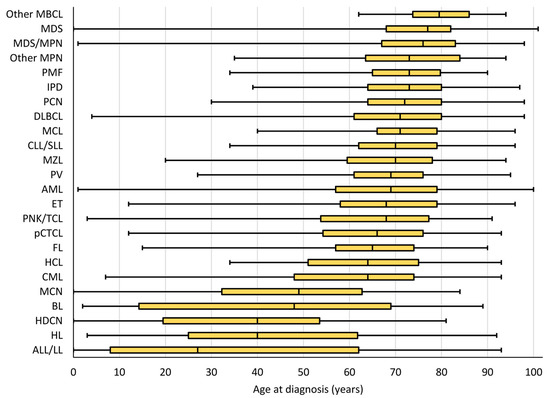 Although almost all HM types can be diagnosed at any age, the majority are predominantly diagnosed in adults with an incidence that increases with age. Only ALL/LL, HL, histiocytic, and dendritic cell neoplasms (HDCNs), Burkitt lymphoma/leukaemia (BL) and mast cell neoplasms (MCNs) exhibit a bimodal distribution, with two incidence peaks in younger and older patients [1] and a resulting median age below 50 years (Figure 2, Table 1).
