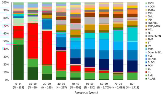 ALL/LL is the most frequently diagnosed HM (46%) in children (0–14 years), followed by HL, which is the predominant HM in adolescents (15–19 years) and young adults (20 to 39 years) (46% and 33% of all HM diagnosis, respectively). From the age of 40, the most common HM types are PCN (15%), DLBCL (12%), CLL/SLL (12%), and MDS (12%) without any predominance of one type (Figure 3).