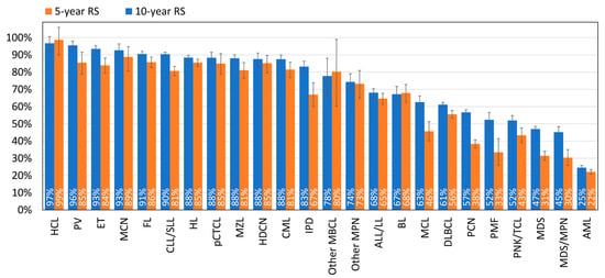 We can also distinguish between certain HM types that have a nearly stable RS between 5 and 10 years of follow-up, such as HCL and BL (and to a lesser extent, ALL/LL and AML), versus others with a drop of over 33% between 5- and 10-year RS (PMF, MDS, MDS/MPN, PCN) (Figure 4). This is also illustrated with the conditional 5-year RS, which is around 100% 5 years after the diagnosis of HCL or BL, followed by HDCN, HL, pCTCL, MCN, and ALL/LL, while it is below 68% for PMF, MDS, MDS/MPN, and PCN (conditional 5-year RS; Table S2).