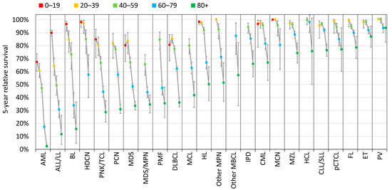 For every HM type, survival outcome progressively worsens with age at diagnosis. The greatest variation is observed for BL, ALL/LL, and AML: the 5-year RS drops from 97%, 90%, and 67%, respectively, for children and adolescents, to 16%, 12%, and 2%, respectively, in 80+ adults. ET and PV exhibit a minor variation: the 5-year RS remains around 90% for the oldest age group of 80+ (Figure 5).