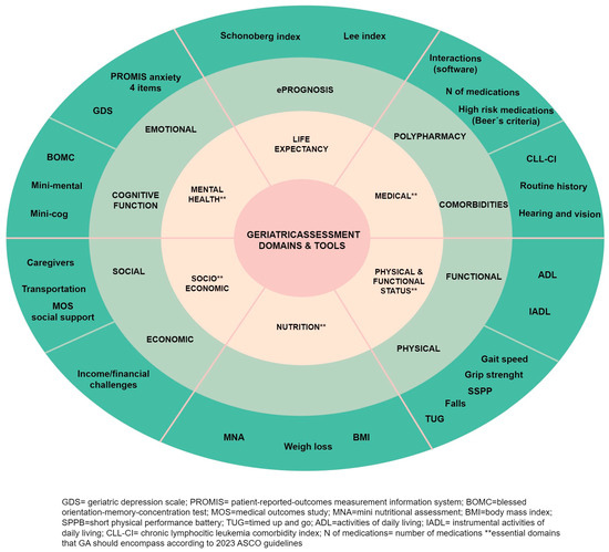 - Dale, W.; Klepin, H.D.; Williams, G.R.; Alibhai, S.M.H.; Bergerot, C.; Brintzenhofeszoc, K.; Hopkins, J.O.; Jhawer, M.P.; Katheria, V.; Loh, K.P.; et al. Practical Assessment and Management of Vulnerabilities in Older Patients Receiving Systemic Cancer Therapy: ASCO Guideline Update. J. Clin. Oncol. 2023, online ahead of print, JCO2300933. [Google Scholar] [CrossRef]