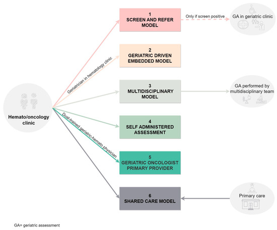 - Chapman, A.E.; Elias, R.; Plotkin, E.; Lowenstein, L.M.; Swartz, K. Models of Care in Geriatric Oncology. J. Clin. Oncol. 2021, 39, 2195–2204. [Google Scholar] [CrossRef]