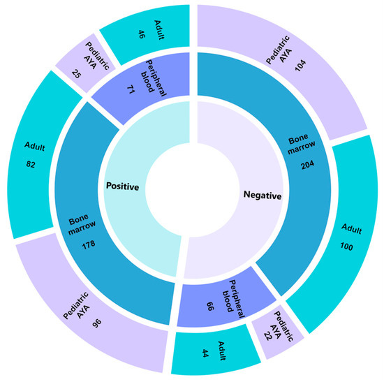 Pan-Heme diagnostic yield. Sunburst plot highlighting diagnostic yield across 522 individuals who underwent testing on the Pan-Heme panel. The innermost circle denotes positive (defined as either a Tier I or II event according to AMP/ASCO/CAP guidelines) or negative findings with tissue type and age group reported in the middle and outermost circles, respectively. AYA, adolescent/young adults.