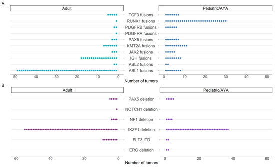 Among clinically significant fusions in the adult cohort, ABL1 and ABL2 fusions were the most frequent, with BCR::ABL1 fusion identified in 39/51 (76%) individuals (Figure 2). Of those 39 individuals with BCR::ABL1 gene fusion, 37 (95%) presented with acute lymphoid leukemia. Among the pediatric/AYA cohort, the ETV6::RUNX1 fusion typically associated with a favorable outcome in acute lymphoblastic leukemia was most frequent (Figure 2). Among both pediatric and adult cohorts, IKZF1 deletion was the most common intragenic structural rearrangement, frequently involving deletion of exons 2-3, exons 2-6, exons 2-7, and exons 4-7 (Figure 2 and Figure S1). By expanding our analysis to include intragenic structural rearrangements, we identified that 10% (51/522) of individuals harbored an intragenic rearrangement concurrently with a gene fusion, with a statistically significant preference towards adults (12%, 34/273) relative to the pediatric/AYA (7%, 17/249) group (p = 0.03, Figure S1, Table S2). Additionally, we identified a single individual with B-cell precursor acute lymphoid leukemia with two intragenic deletions involving IKZF1 and PAX5, in the absence of an ERG deletion, suggestive of the IKZF1plus phenotype [30].