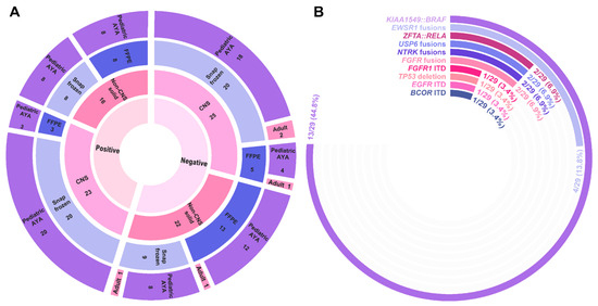 Pan-Solid diagnostic yield. (A) Sunburst plot highlighting diagnostic yield across 37 individuals who underwent testing on the Pan-Solid panel. The innermost circle denotes positive (defined as either a Tier I or II event according to AMP/ASCO/CAP guidelines) or negative findings with disease type, tissue type, and age group represented by the outer circles. CNS, central nervous system; FFPE, formalin-fixed paraffin embedded; AYA, adolescent/young adult. (B) Radial bar chart demonstrating the frequency of fusions and structural rearrangements identified by the Pan-Solid panel.