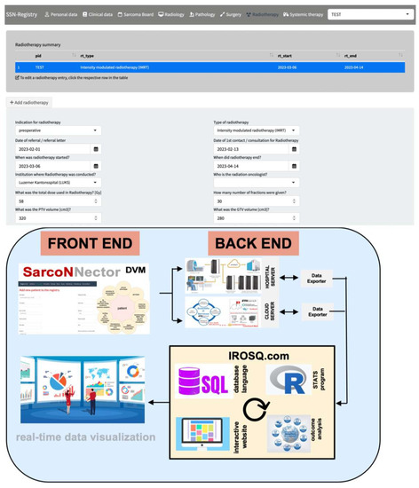 The Sarconnector® presents an intuitive, self-explanatory front end, separated according to the respective disciplines (Figure 1). For each discipline, a minimal dataset of relevant parameters are requested to enter. The case report form is provided in the supplementary data (SUPP). At the top, it provides a summary of what type of, e.g., radiation therapy was performed. Specifically, besides the type of radiation performed, it also includes the use of a flab, the critical tumor volume/gross tumor volume (CTV/GTV) volumes, and the color wash. Because all disciplines assess their respective information regarding work-up and therapy, these parameters can be analyzed in relation to each other.