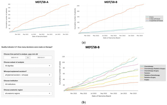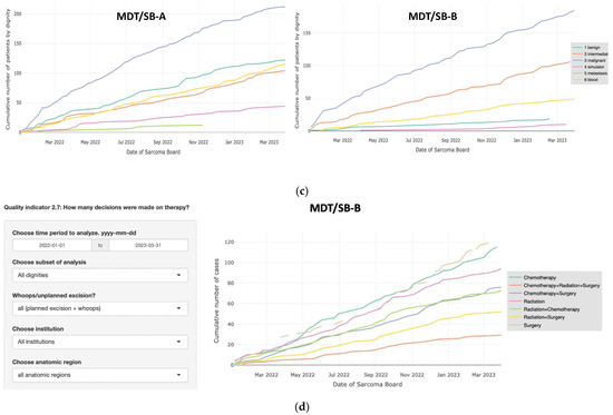 The Sarconnector® allows the interactive comparative visualization of the basic data with respect to a given time period, according to anatomic location, tumor biology or dignity of the tumor, and according to therapy, side by side for the respective MDT/SB (Figure 3a–d). The incidence of diagnosis or type of therapy is visualized over time to easily compare subgroups. Visualization of data is critically important to define subgroups for detailed analysis. Importantly, based on the selection of the subgroups to be defined for analysis, the system links the graphs with the respective raw data such that further detailed analysis can be carried out.