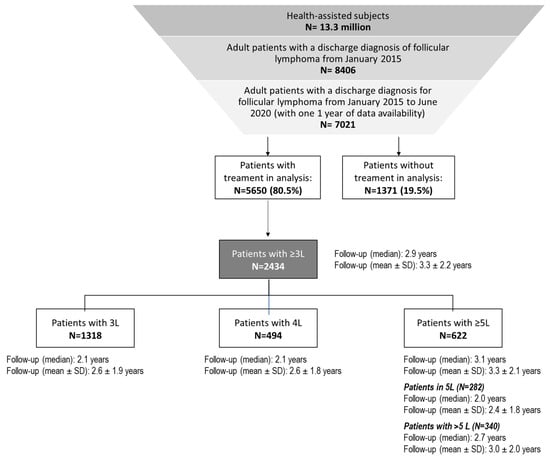 Among the study sample covering a catchment area of about 13.3 million residents, 8406 diagnoses of follicular lymphoma were found starting from January 2015. Among them, 7021 patients had a hospital discharge diagnosis for follicular lymphoma with at least one year of data availability before and after hospitalization. Of these, 5650 (80.5%) were receiving a treatment or procedure during all the study period, and 2434 had at least three lines of treatment. The total 2434 patients with ≥three lines had a median follow-up duration of 2.9 years. Of them, 1318 were in 3L (median follow-up 2.1 years), 494 in 4L (median follow-up 2.1 years), 622 in ≥5L (median follow-up 3.1 years).