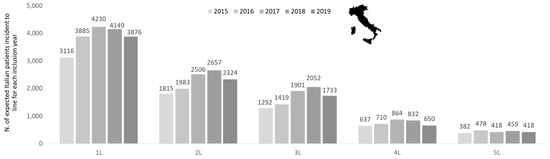 The data on patients incident to a specific line of treatment during each inclusion year were re-proportioned to the Italian population (Figure 2). Considering that, according to the census of the Italian Institute of Statistics, the national population consisted of approximately 60 million residents in the period 2015–2019 [25], the projections estimated a number of incident patients from 3116 (2015) to 4230 (2017) in 1L, from 1815 (2015) to 2657 (2018) in 2L, from 1292 (2015) to 2052 (2018) in 3L, from 637 (2015) to 864 (2017) in 4L, and from 382 (2015) to 478 (2016) in 5L (Figure 2).