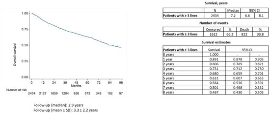 During a median follow-up of around 3 years, 34% of patients with ≥3L of therapy died. Median overall survival was of 7 years (Figure 3).