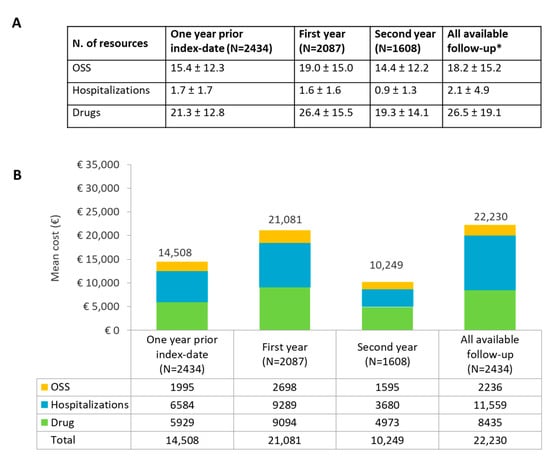 (A) Consumption of healthcare resources (mean ± SD) and (B) direct mean annual costs deriving from drugs, OSS (outpatient specialist services, namely diagnostic/laboratory tests and specialist visits) and hospital admissions. Evaluations were performed during the year before index date, during the first and second years, and for the whole available follow-up (* duration of all available follow-up: 3.3 ± 2.2 years).