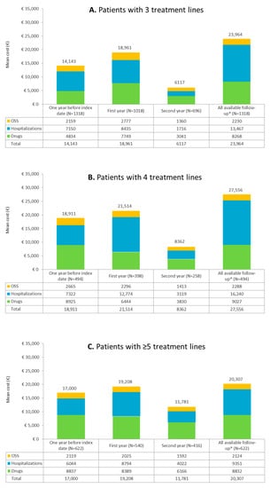 Direct mean annual costs during the year before index date, the first and second years of follow-up, and for the whole available follow-up for follicular lymphoma patients with (A) 3 treatment lines, (B) 4 treatment lines, and (C) ≥5 treatment lines. * Duration of all available follow-up: 2.6 ± 1.9 years for patients with 3L, 2.6 ± 1.8 years for patients with 4 L and 3.3 ± 2.1 years for patients with ≥5 treatment lines.