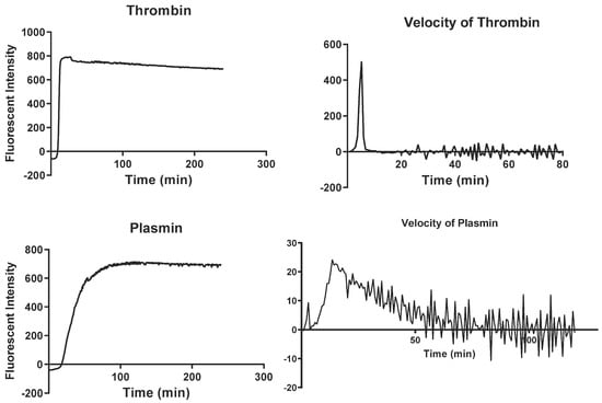 Two substrates were prepared with a final concentration of 100 µM and used for the detection of the enzymes, α-thrombin (BOC-VAL-PrO-ARG-MCA, Peptides International, 5 mg) and plasmin (BOC-GLU-LYS-LYS-MCA, Peptides International, 5 mg). The first two wells of the plate (Grelner, 96w Flat bottom, Black Clear) were used as a blank, and the samples were run in duplicate in parallel rows for each substrate, avoiding potential interference and/or interaction in signal detection.
