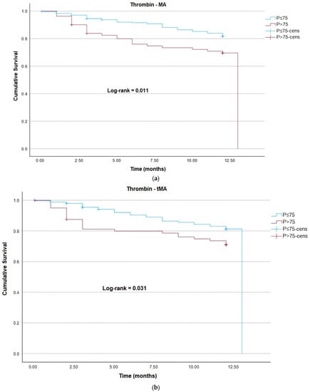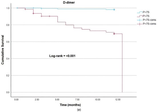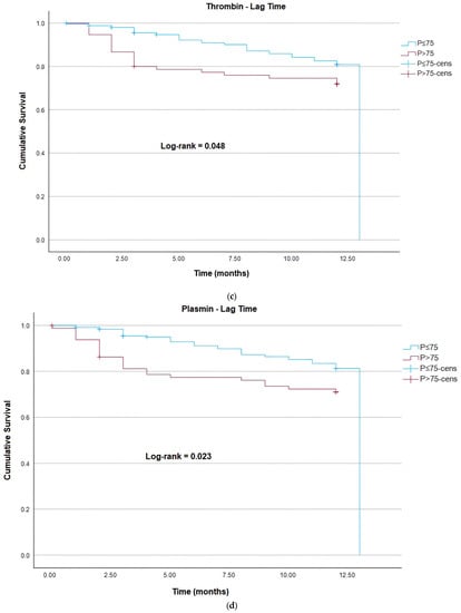 For evaluation of mortality risk using the Kaplan–Meier method, the parameters of plasmin generation and thrombin were dichotomized into two groups using the 75th percentile. Statistically significant values (log-rank p < 0.05) were identified for the parameters of thrombin MA, thrombin tMA, thrombin lag time, and plasmin lag time above the 75th percentile, meaning that patients in this groups have a higher risk of mortality (Figure 2a–d). Similarly, a significative association between D-dimer and risk of death was also identified for patients above the third quartile (Figure 2e).
