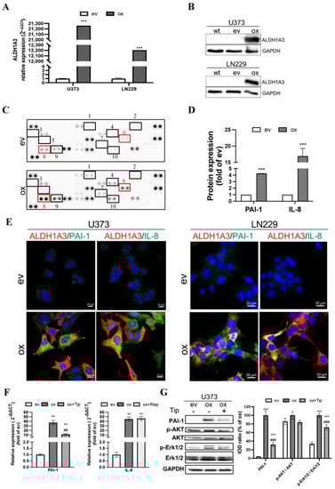 Upregulation of ALDH1A3 in oxGBM cells is associated with the increased expression and release of pro-angiogenic factors PAI-1 and IL-8. GBM cell lines were transduced with ALDH1A3 for overexpression (oxGBM) or with empty vector (evGBM). (A) Confirmation of up-regulation of ALDH1A3 mRNA level in oxGBM cells by RT2-PCR. (B) Confirmation of up-regulation of ALDH1A3 protein expression by Western blot. wt, wild-type cells. The uncropped blots are shown in Figure S7; (C) Angiogenesis array. The blots showed duplicated dots for 55 angiogenesis-related proteins in the media of oxU373 or evU373. 10 of 55 proteins were upregulated more than 2-fold in ox group compared to ev group (indicated by rectangle). They are: (1) Ang-1, (2) artemin, (3) TF, (4) ET-1, (5) GM-CSF, (6) IL-8, (7) PDGF-AA, (8) PAI-1, (9) PEDF, and (10) uPA. (D) Semi-quantification of the dots representing PAI-1 and IL-8. (E) Immunofluorescence staining of GBM cells. U373 (left panel) and LN229 (right panel). Co-localization of ALDH1A3 with PAI-1 and IL-8 was observed in oxGBM cells, whereas no immunoreactivity of PAI-1 and IL-8 was detected in evGBM cells. (F) mRNA expression of PAI-1 and IL-8 in transduced U373 cells and the effect of inhibitors. Tiplaxtinin (Tip, 30 µM) and reparixin (Rep, 1 µM) are the specific inhibitors of PAI-1 and IL-8 receptors CXCR1/2, respectively. (G) Detection of PAI-1 and potential signaling proteins by Western blot. IOD: optical density. The uncropped blots are shown in Figure S8. **, p < 0.01; ***, p < 0.001, compared with ev. ##, p < 0.01; ###, p < 0.001, compared with ox.